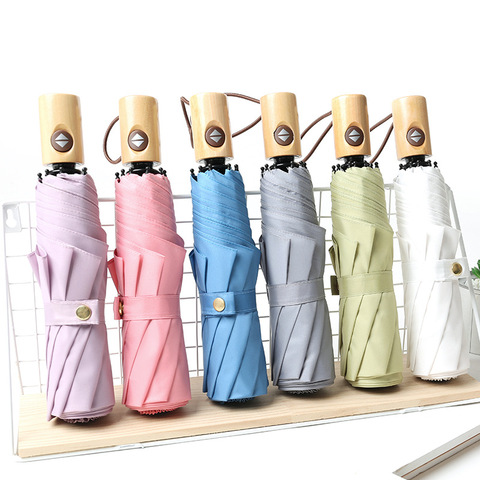 مظلة سفر مدمجة عالية الجودة مقاومة للماء ثلاثية الطي مع طباعة شعار مخصص، أوتوماتيكية بالكامل ومقاومة للرياح، بمقبض خشبي